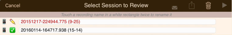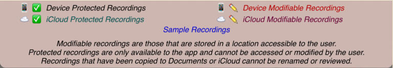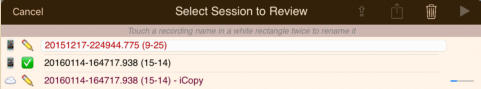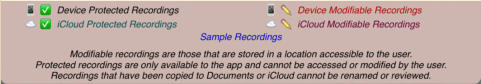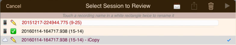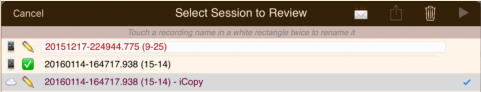 The session review form implements the copies and the emails. The form has a footer that describes the legend used to the left of each session recording shown on the form:The navigation bar at the top of the form has disabled export and email links until a suitable file or copy is selected. Also session recordings that may be renamed have their names contained in a white rectangle:Select a recording that can have copies made and the navigation bar at the top changes to:Touching the export button brings up an option selection dialog. The help link is to this document. In this case we will select iCloud Drive:There is a progress indicator against the recording while the copy is made and it is transferred to its local destination:When the copy completes the form is updated to show the new file:You can’t email links to a session recording until it has been uploaded to the iCloud server. Selecting an iCloud copy which has not been copied up to iCloud as yet results in the disabled mail icon changing to an upload symbol where the selection tick normally is there is now a progress bar:After the upload to iCloud selecting an unprotected iCloud Drive copy results in the navigation bar changing to having the email button enabled:When you touch the button a spinner shows while iCloud makes a copy of the file:After the copy has been made and the download links generated an iOS Mail compose dialog opens with pre-populated text containing the down load links:When making protected copies for email everything is exactly the same up to the point of mail composition. With protected copies a form open allowing you to fill in the recipients (To: & CC:) and a portion of leading text:The received protected email looks as follows. The link at the end of the email is to this document.