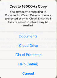 This option allows the export of 16000Hz copies of monitoring session recordings to iCloud Drive and also Documents if session recordings are being stored in a protected area. iCloud Drive is accessible to the user on both the iOS device and their computer. Recordings stored in Documents can be accessed using iTunes file sharing. Both these areas are read and write enabled to the user so the app treats them as unprotected.Once a recording has been copied to iCloud it has to be uploaded to the iCloud server before a link to it can be emailed. The email implementation here uses iOS Mail with pre-populated text all of which can be altered. Both the copy and the email are implemented on the review form where you select recordings.If the email is from the user then there can be no guarantee that the files are unaltered.