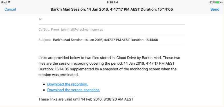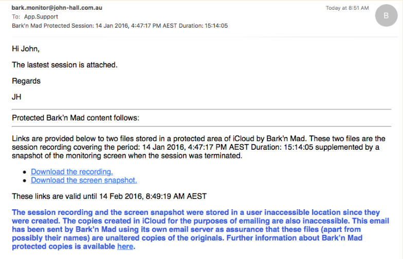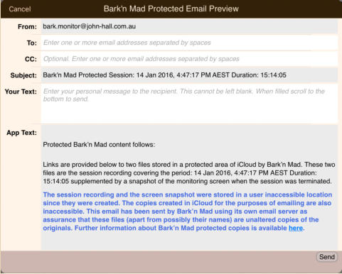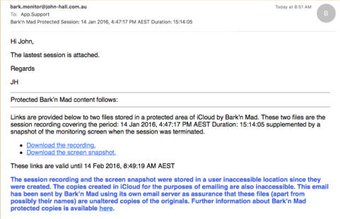 Versions of the Bark’n Mad app downloaded after mid January 2016 store session recordings in a protected area inaccessible to the user prior versions stored them in Documents where they were accessible via iTunes file sharing. Regardless of when the app was downloaded when this option is enabled all future monitor recordings are stored in protected app storage where they cannot be modified. Older recordings that were stored in Documents cannot be made protected.The export of 16000Hz copies to iCloud is done to a protected inaccessible area in iCloud. Once again the copy has to be uploaded to the iCloud server before a link to it can be emailed. In this case as we have a session recording that has always been maintained in a protected area the email of the download links also has to be protected if we are to guarantee that it is a protected and unaltered 16000Hz copy of the original monitor recording. The email is sent using the app’s own email server which is enabled for this purpose. The user is able to enter the recipients, CC copies and initial text. The app adds the links and text guaranteeing that the links are to unaltered copies of the original recordings.If the email is from Bark’n Mad (bark.monitor@john-hall.com.au) then to the best of our ability I guarantee they are original unaltered copies.