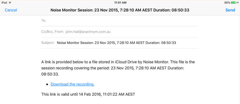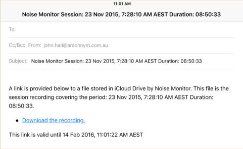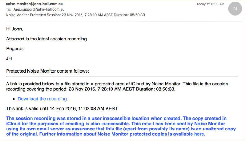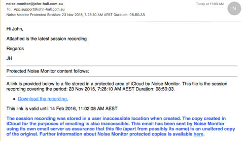 Versions of the app downloaded after mid January 2016 store session recordings in a protected area inaccessible to yourself, prior versions stored them in Documents where they were accessible to iTunes file sharing. Regardless of when the app was downloaded when this option is enabled all future monitor recordings are stored in protected app storage where they cannot be modified. Older recordings that were stored in Documents cannot be made protected.The export of 16000Hz copies to iCloud is done to a protected inaccessible area in iCloud. Once again the copy has to be uploaded to the iCloud server before a link to it can be emailed. In this case as we have a session recording that has always been stored in a protected area the email of the download links also has to be protected if we are to guarantee that it is a protected and unaltered 16000Hz copy of the original monitor recording. The email is sent using the app’s own email server which is enabled for this purpose. You are able to enter the recipients, CC copies and initial user text. The app adds the links and text guaranteeing that the links are to unaltered copies of the original recordings.If the email is from Noise Monitor (noise.monitor@john-hall.com.au) then to the best of our ability I can guarantee they are original unaltered copies.